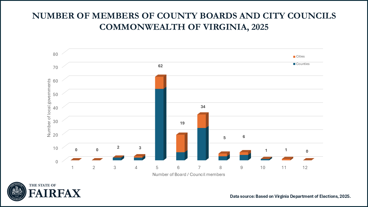 As a result of the various forms of county governance, the number of county board members (or the size of city councils) varies somewhat between different local jurisdictions. The typical (modal) local government board or council has five members. In aggregate, Virginia’s 133 local governments are led by 795 locally elected representatives. This means that, on average, a local government board or council in Virginia has six (5.98) members.