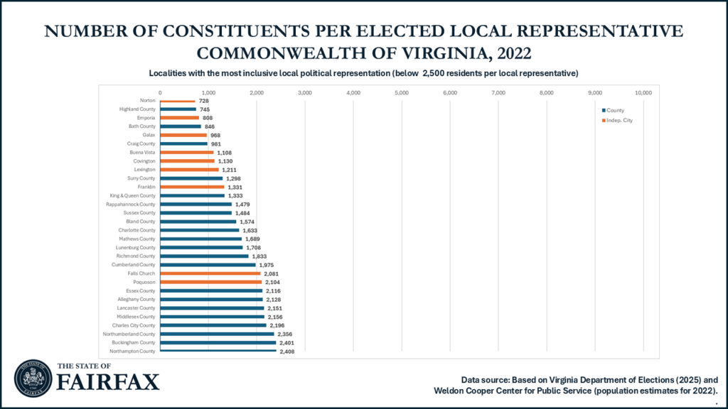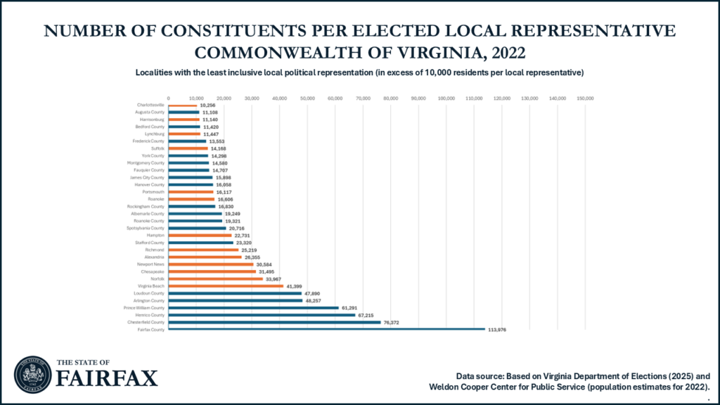 For instance, an elected representative in Fairfax County has only one-tenth of the time to spend with each of his or her constituents when compared to the state’s average, and only one-hundredth of the time to listen to each constituent’s concerns compared to the localities in Virginia where local political representation is greatest.