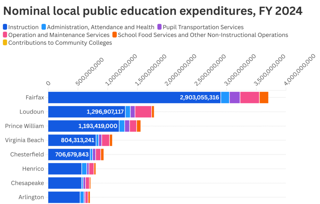 Fairfax County Public Schools (FCPS) is the state’s largest division by population and enrolment, educating about 172,422 students. Unsurprisingly, FCPS also has the largest total local K–12 outlay—about $3.7 billion in FY 2024. Scale matters: big systems will always dominate totals.