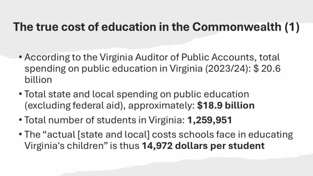 Step 1: Expressing the true cost of a quality education in Virginia as a single financial norm. A true-cost analysis begins not with assumptions but with actual audited data. According to the Virginia Auditor of Public Accounts, combined state and local spending on public education in FY 2023–24 totaled about $18.9 billion for 1.26 million students, or roughly $14,972 per student. Of course, the total cost for each county or city would have to determined by multiplying this expenditure norm ($14,972 per student) with the (FTE) number of enrolled K-12 students.