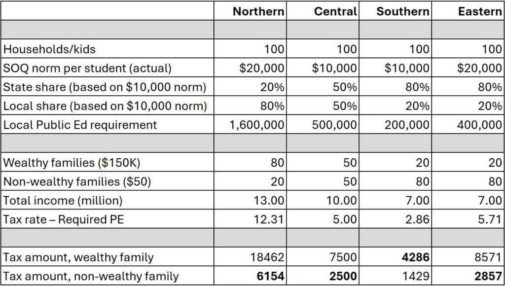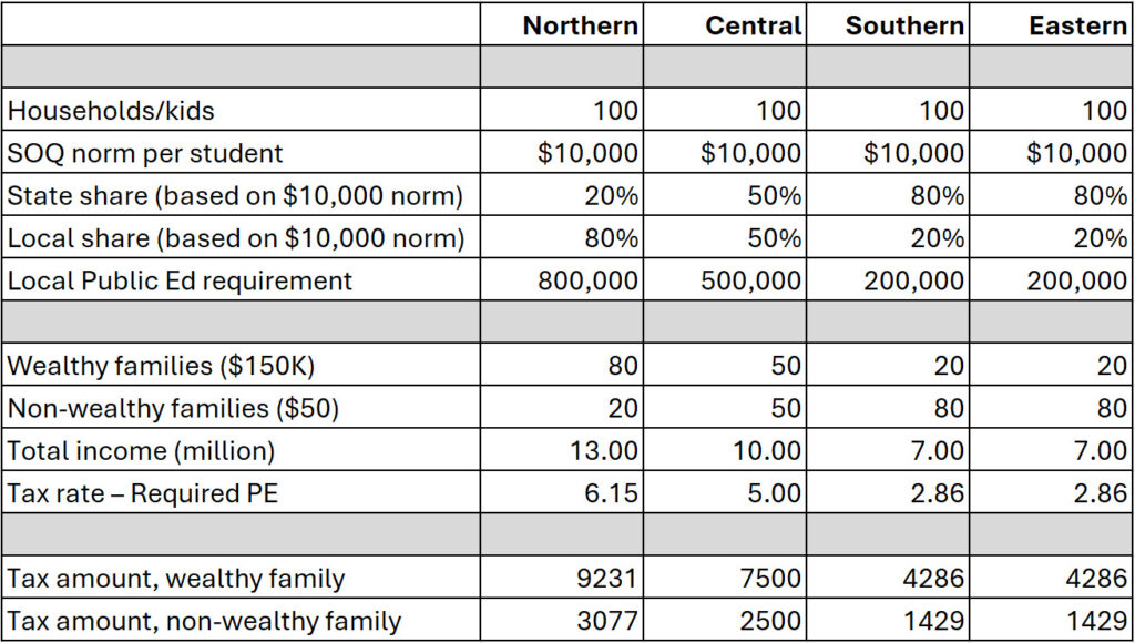 In Virginia, like many other states, we have a fiscal system that does not produce fiscal outcomes that coincide with traditional notions of fairness—regardless whether one prefers a more or less progressive fiscal system. Instead, the way we finance public services—especially public education—produces fiscal outcomes that depend less a household’s income level and more on geography. As a result, households with similar earnings can face very different fiscal burdens depending on where they live, while communities with very different needs are treated in ways that are difficult to justify on either equity or efficiency grounds.