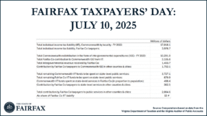 - Fairfax Taxpayers’ Day 2025: July 10The date July 10 holds a special place for Fairfax County taxpayers. Until this date, all the individual income taxes paid by Fairfax County taxpayers to the Commonwealth of Virginia are actually used to provide services for people outside of Fairfax County. Only after July 10–the 191st day of the year–will the state income tax… Read more: Fairfax Taxpayers’ Day 2025: July 10